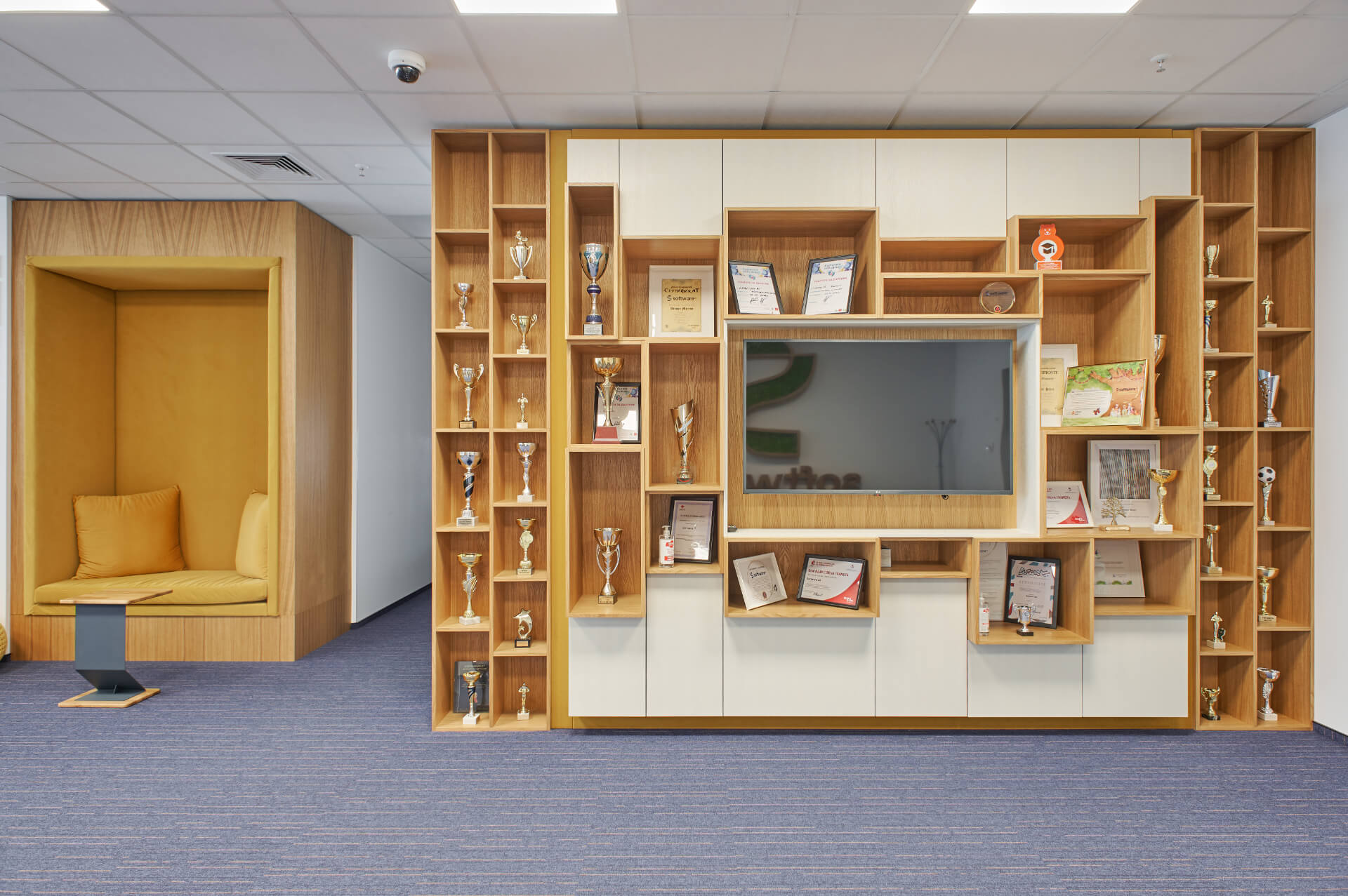 The new entrance now performs three functions simultaneously: reception, socialization zone, and gallery. We designed a custom “Hall of Fame”—a shelving structure that gathers all the team’s sports trophies and awards in one place. This zone immediately communicates team spirit to both employees and guests.