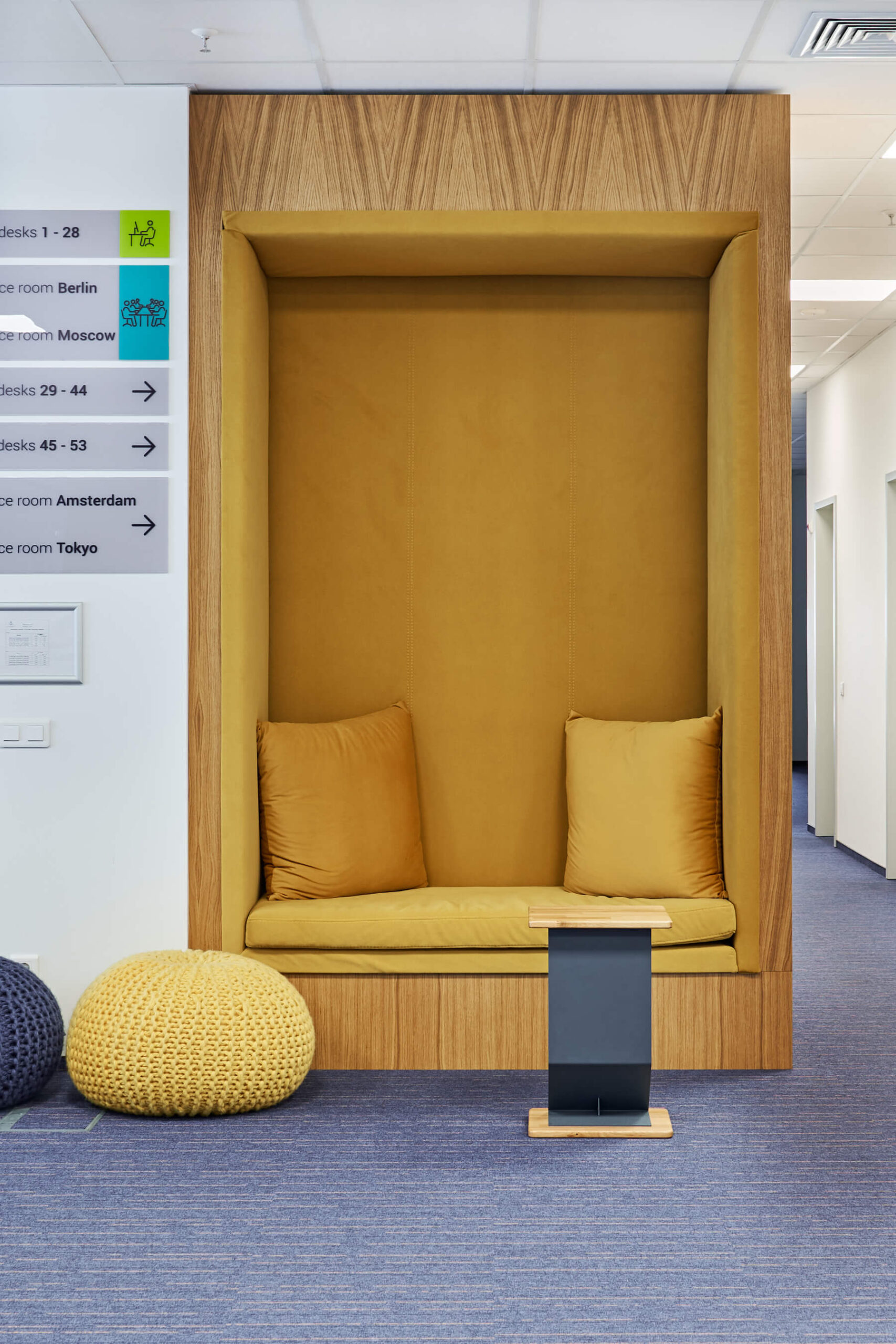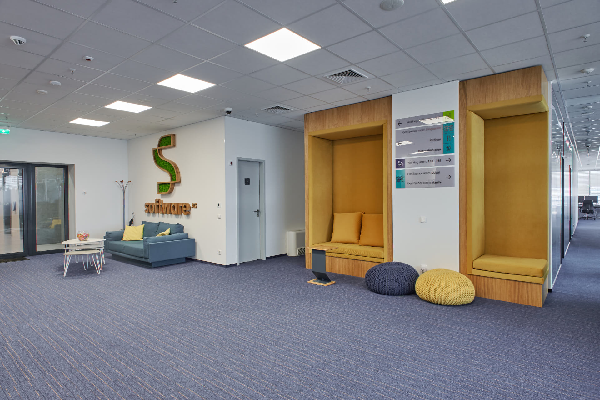 The goal of this project was to rethink and redesign two key spaces within the Software AG office—the Entrance Hall and the “John Atanasoff” room. The objective was not merely cosmetic but a complete functional transformation. The client needed the lobby to cease being just a transit zone for welcoming clients and to evolve into a “social hub”—a place for meetings, informal communication, and showcasing team pride. Simultaneously, the “John Atanasoff” room had to be adapted for new usage scenarios, merging relaxation with opportunities for group discussions.