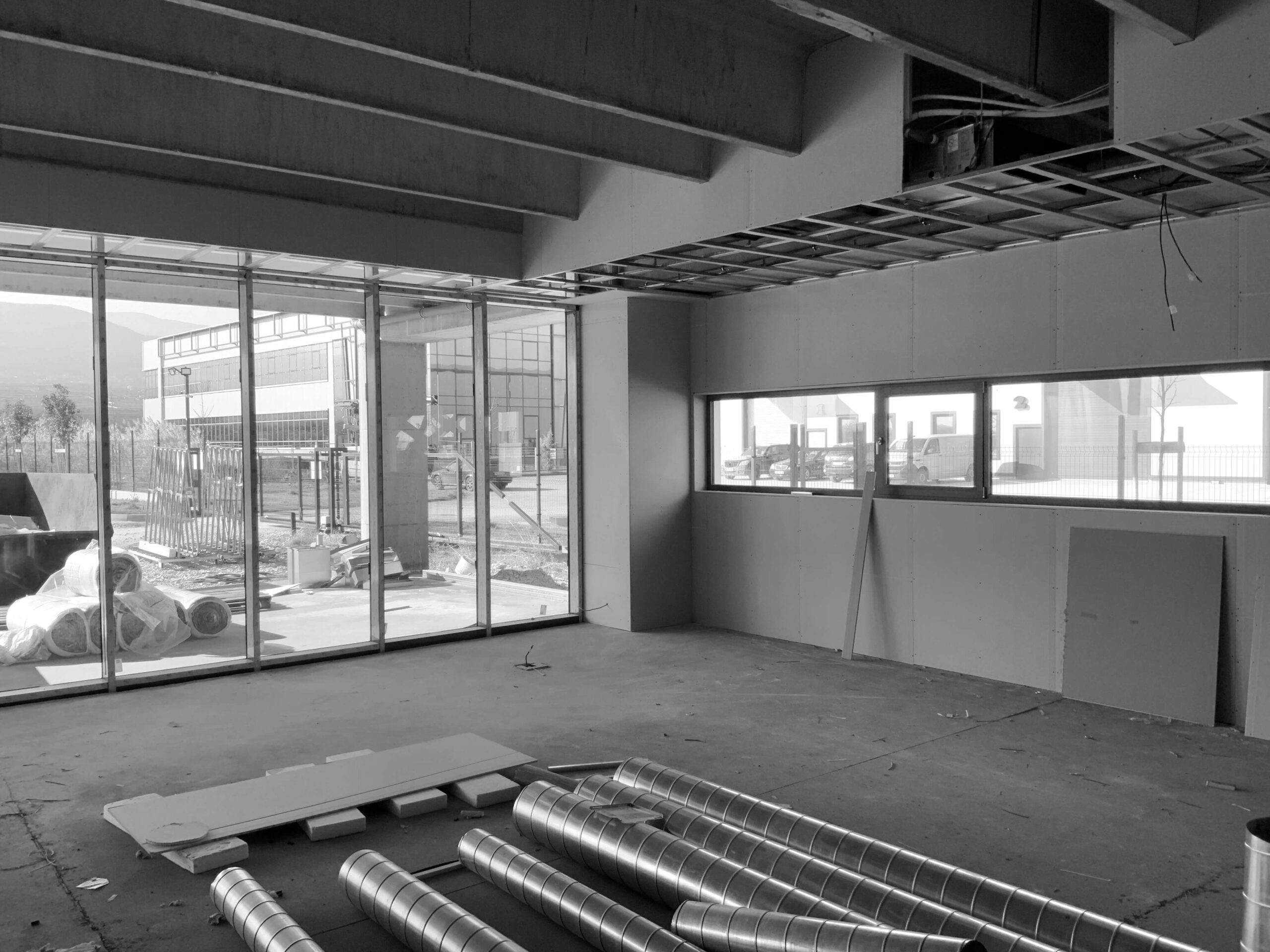 Незавършен търговски интериор от Интериорен дизайн Studio28a, с открити въздуховоди, отворен таван и големи прозорци.