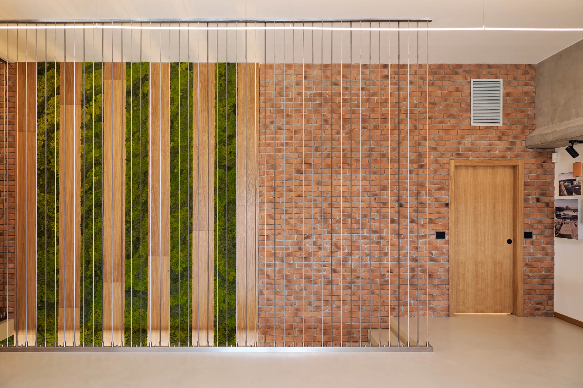 Модерен интериор от Интериорен дизайн Studio28a с тухлена стена, дървена врата, метална преграда и акценти от зелени панели.
