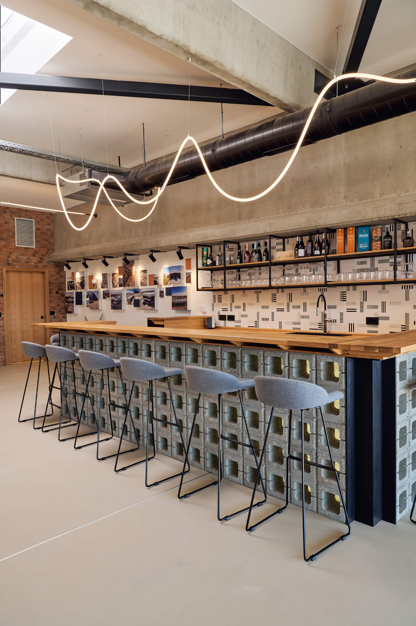 Модерен бар от Интериорен дизайн Studio28a със сиви табуретки, плот от бетонни блокове, тухлени стени и дисплеи за снимки над тях.