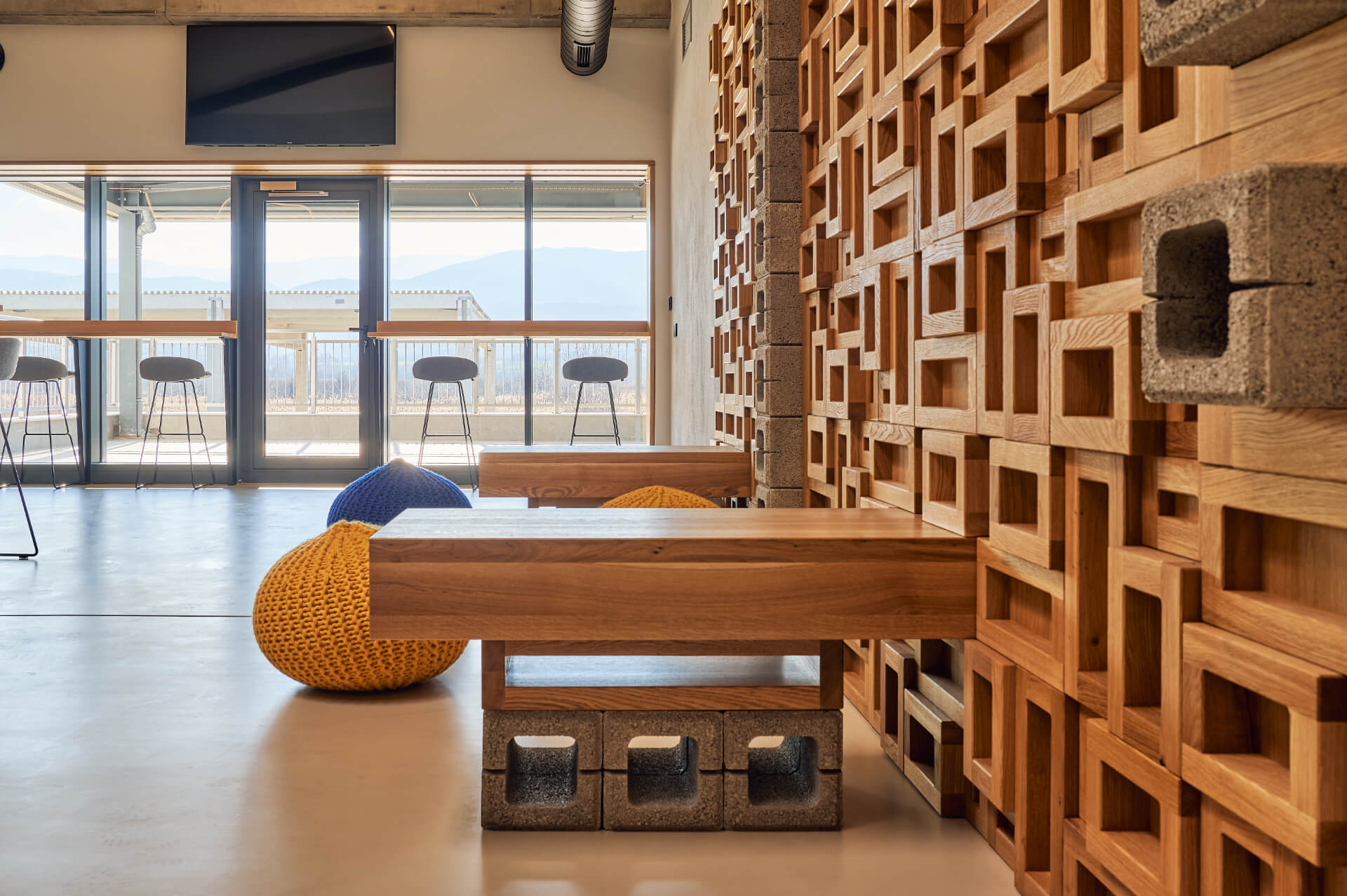 Модерен интериор от Интериорен дизайн Studio28a с дървени пейки, геометрични стени, пуфове и бар столове с изглед към планината.