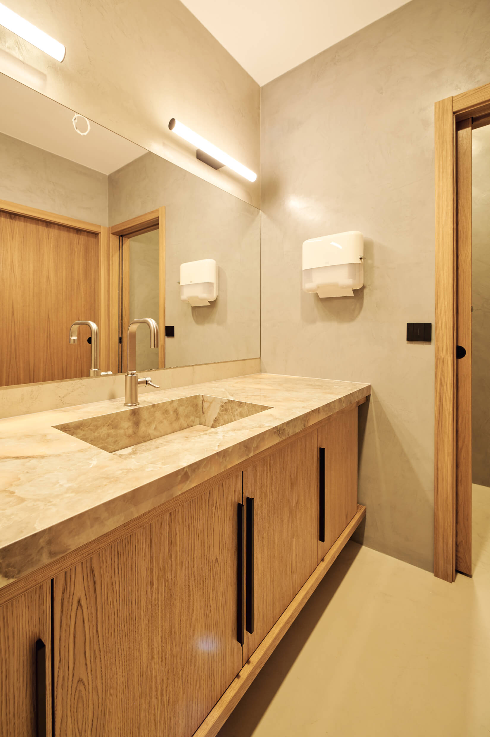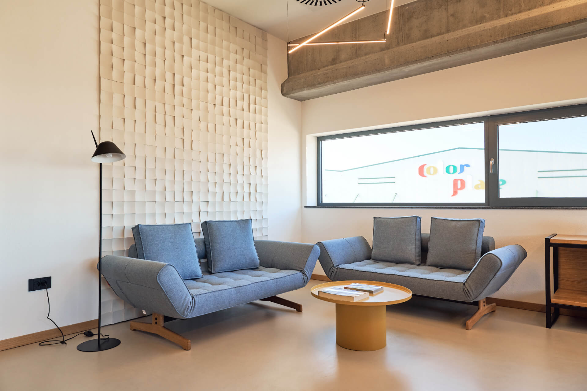 • Светлината: Вълнообразното LED осветление преминава през етажите като метафора за гъвкавост и динамика, омекотявайки суровите индустриални текстури.