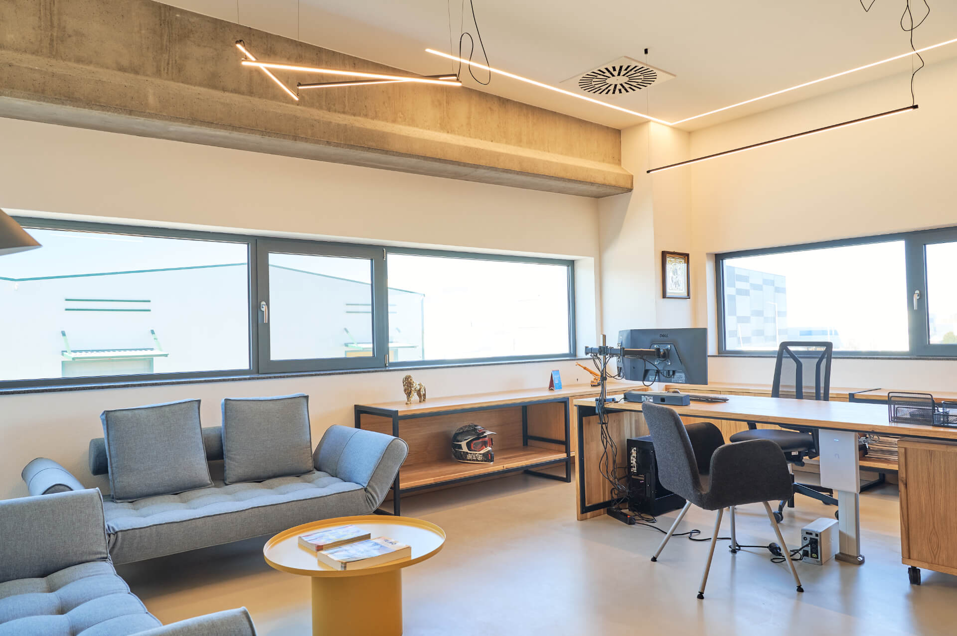 Този проект представлява цялостно оформление на новата административна сграда на водеща строителна фирма в Пловдив. Задачата бе да създадем пространство, което не само отразява дейността на компанията чрез индустриална естетика, но и предоставя съвременни условия за труд и релакс.