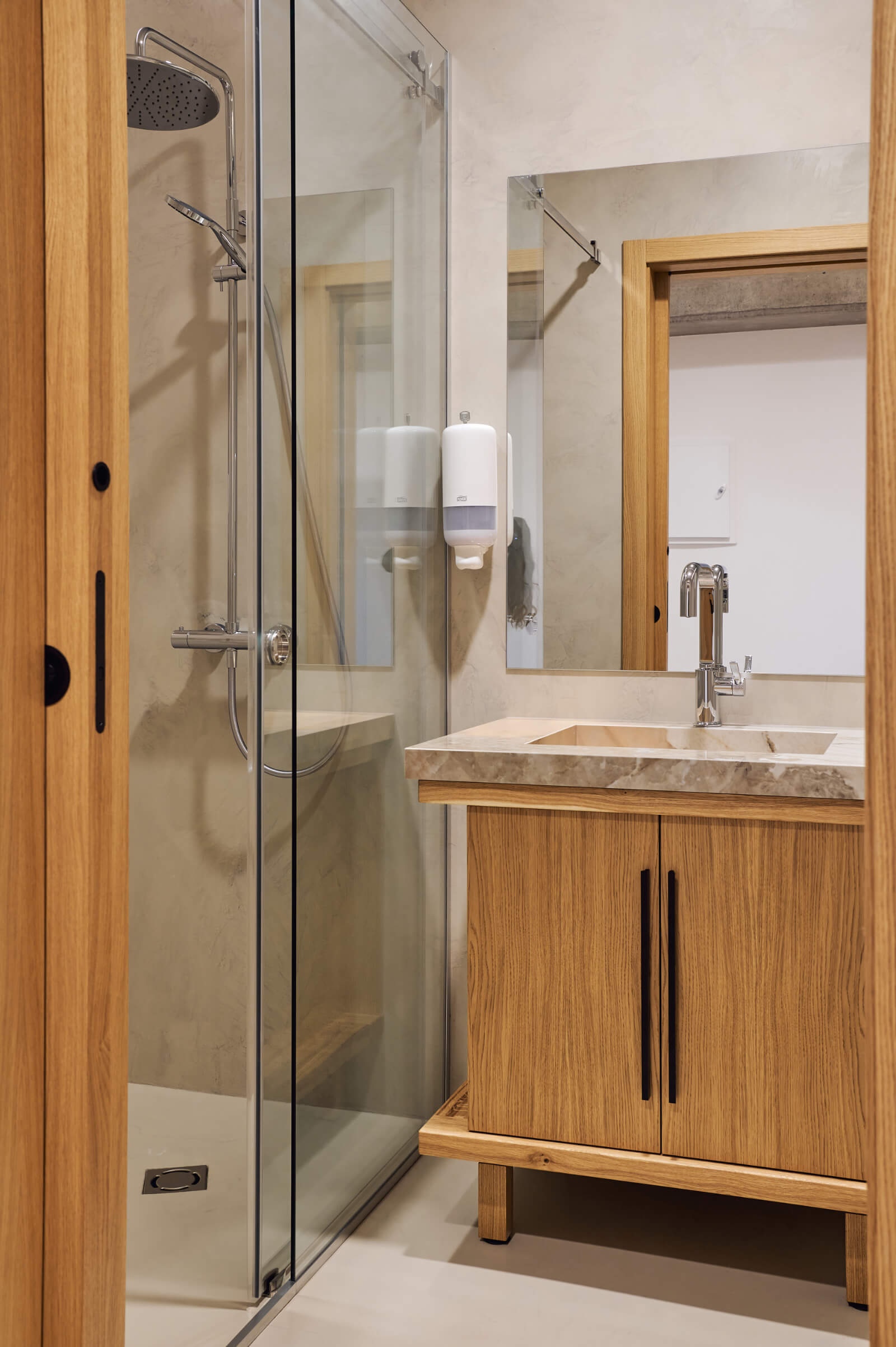 Модерна баня от Интериорен дизайн Studio28a със стъклен душ, дървена тоалетна чиния и монтиран на стената дозатор за сапун.