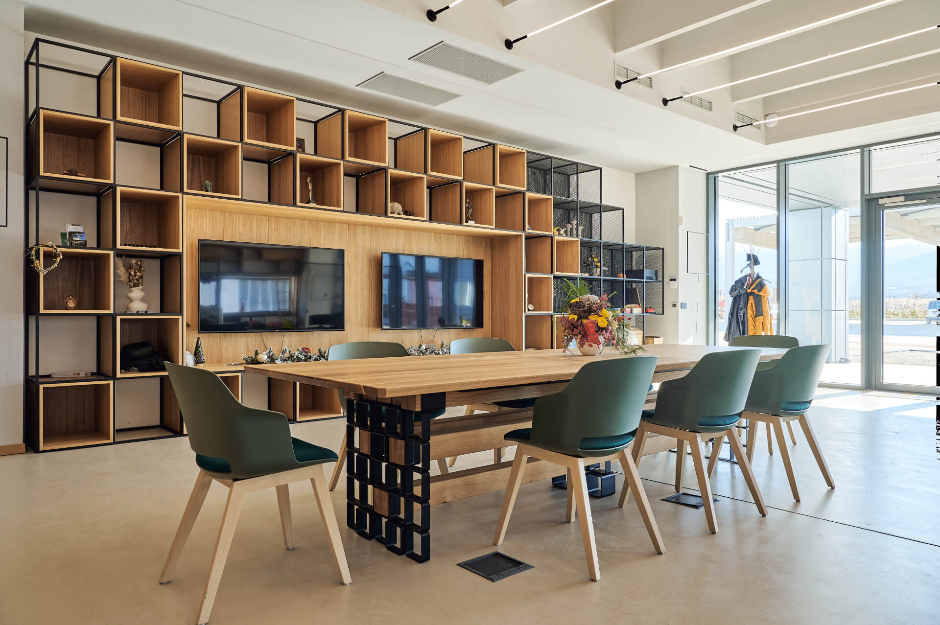 Модерна заседателна зала с дълга дървена маса, зелени столове и Интериорен дизайн Studio28a празнични елементи.