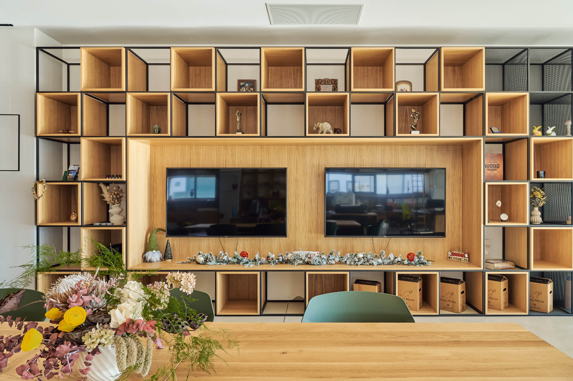 Модерен стенен модул от Интериорен дизайн Studio28a с отворени рафтове, два телевизора и декор зад дървена маса.