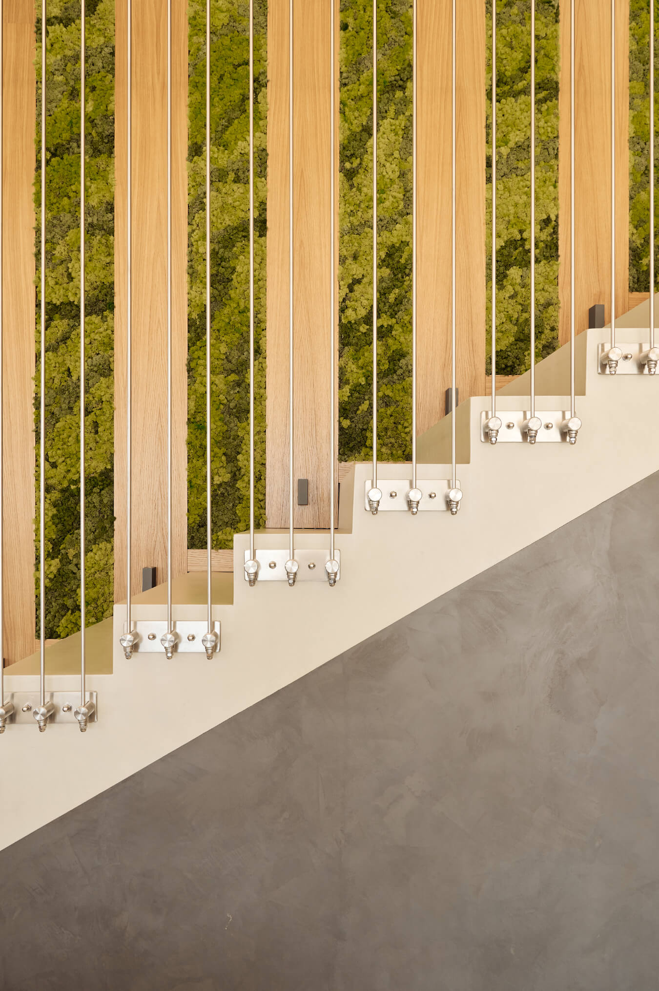Модерно стълбище с дървени ламели, метални въжета и зелена стена от мъх от Интериорен дизайн Studio28a.