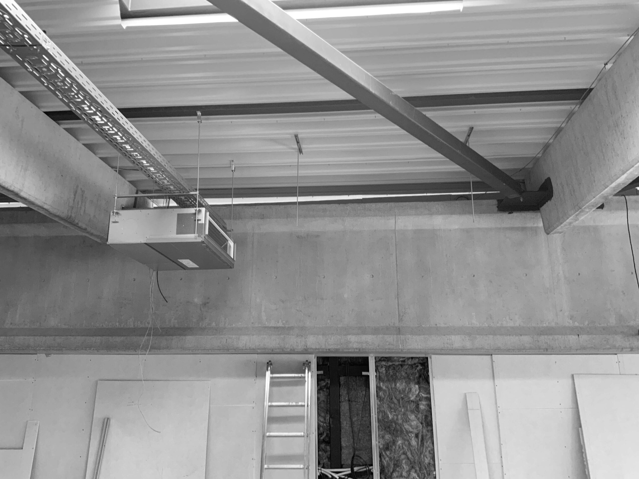 Индустриален таван с открити греди и тръбопроводи от Интериорен дизайн Studio28a; стълба под отворен панел за достъп.