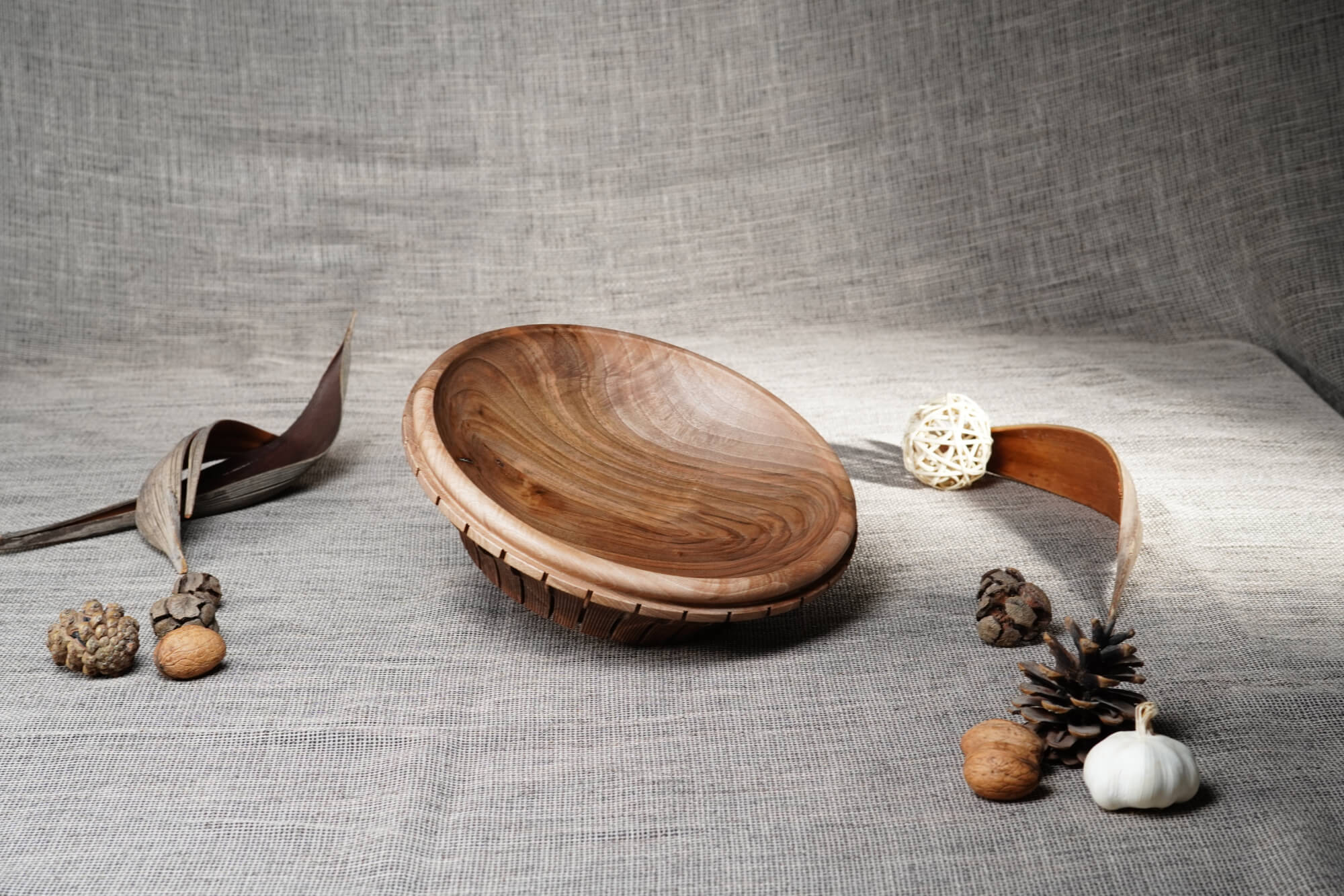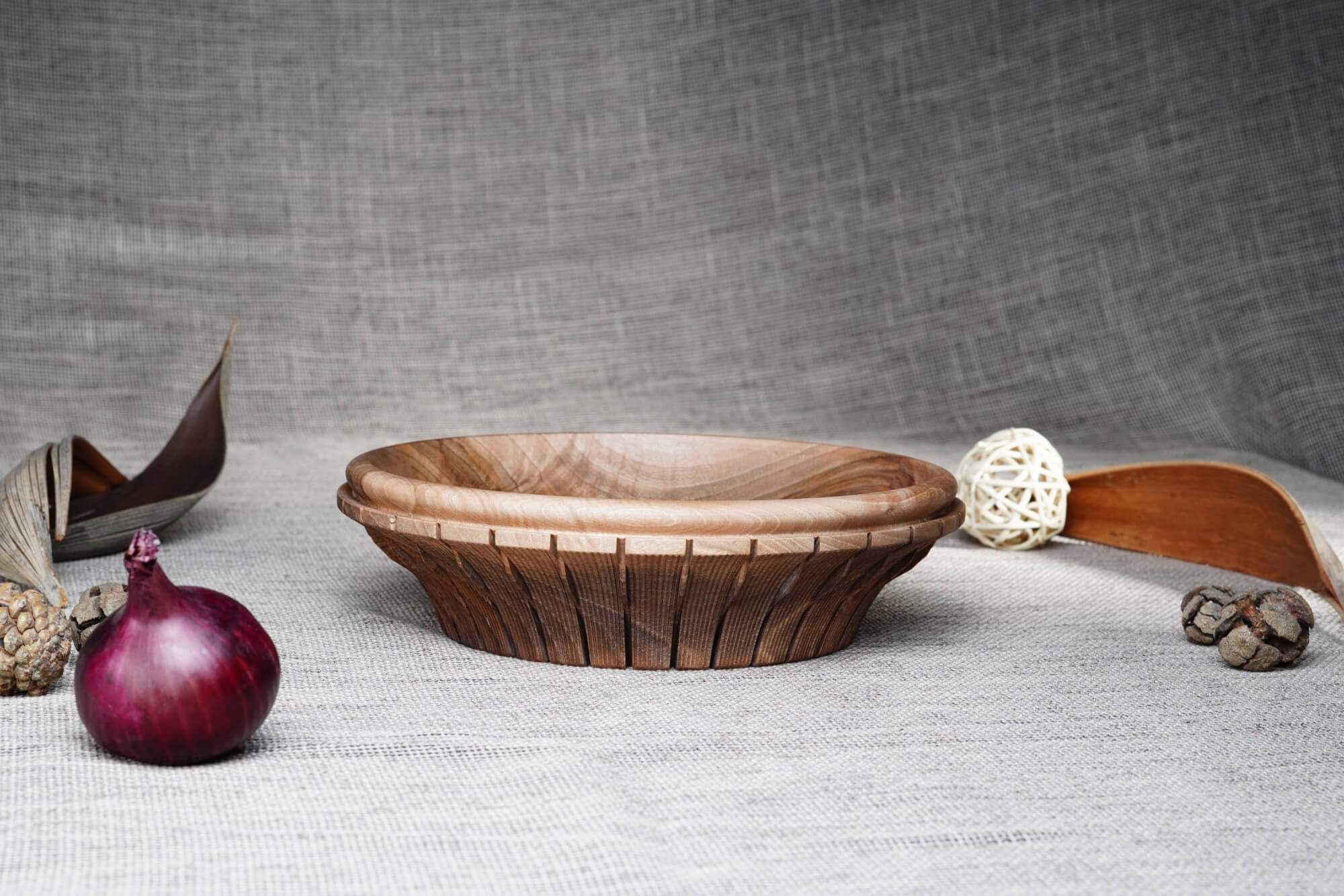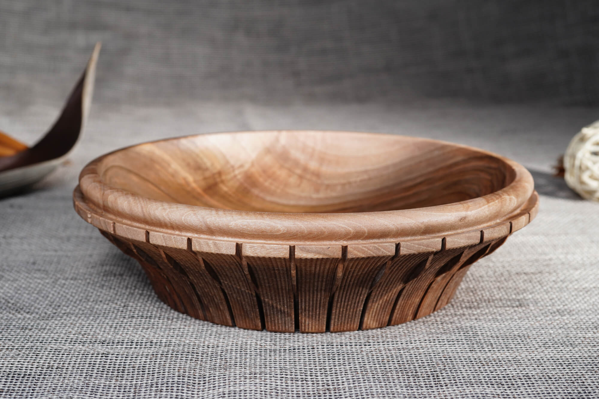 Ръчно изработена купа от масивна дървесина (орех), отличаваща се с фина текстура и елегантен профил. Външната част е декорирана с ритмични вертикални канелюри, добавящи архитектурен детайл към естествената топлина на дървото. Идеален център за трапезната маса или стилен съд за плодове и ядки.