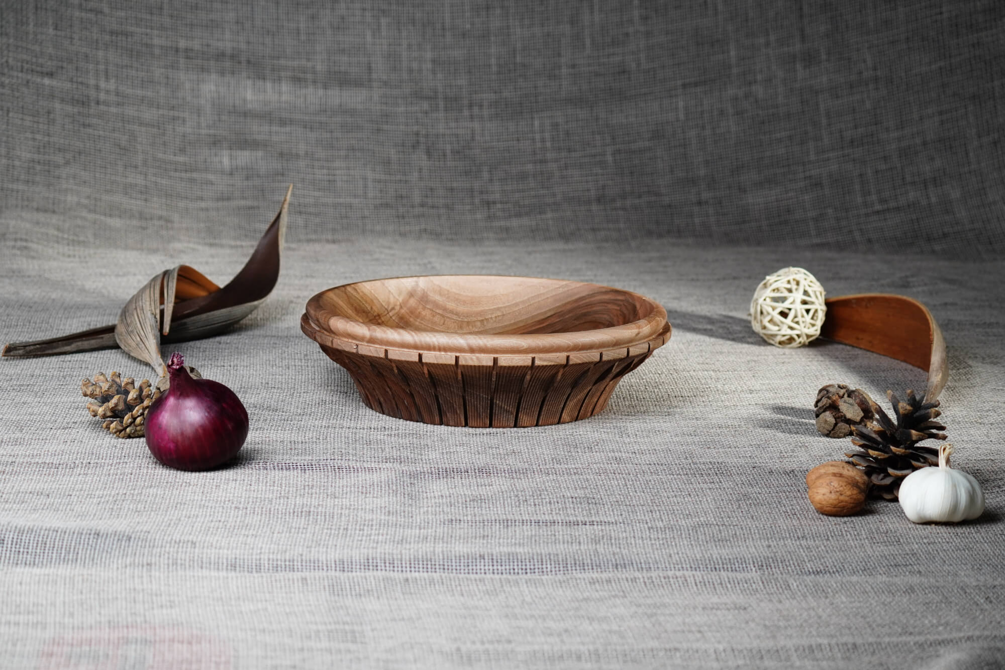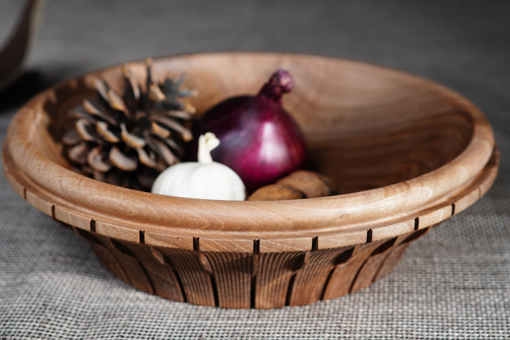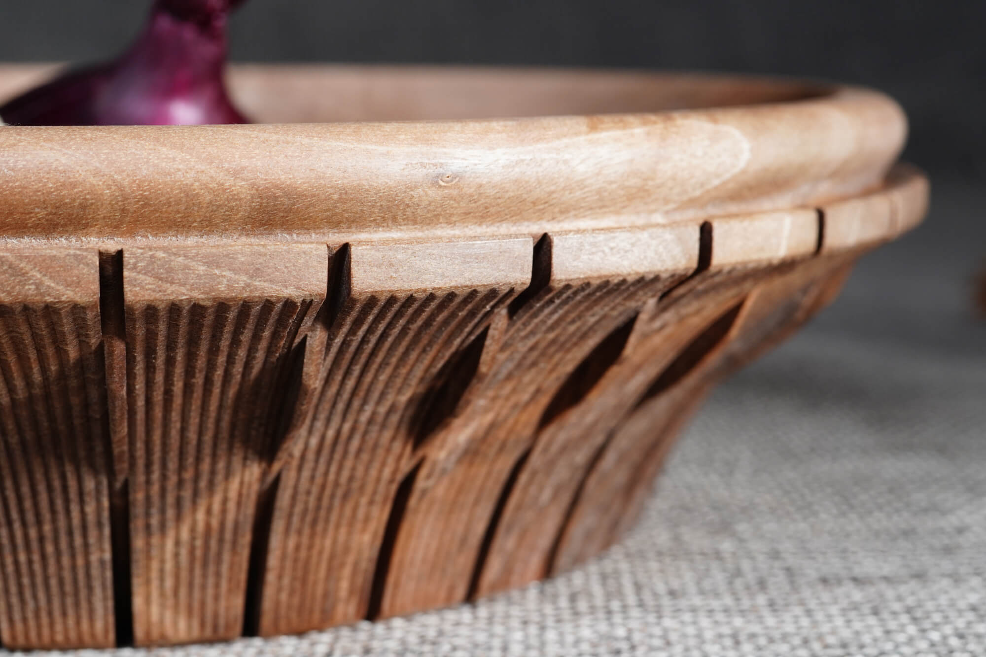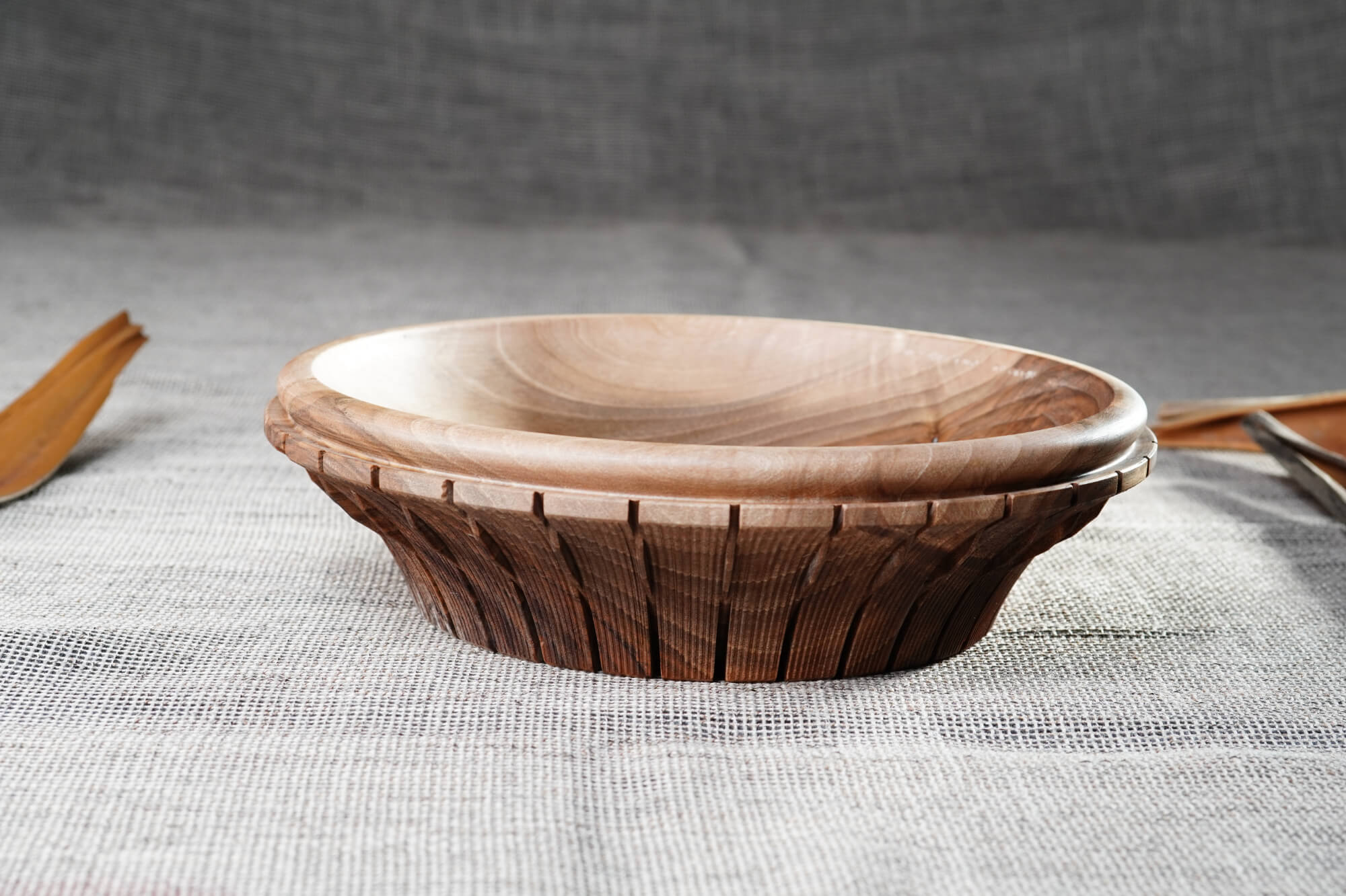 Ръчно изработена купа от масивна дървесина (орех), отличаваща се с фина текстура и елегантен профил. Външната част е декорирана с ритмични вертикални канелюри, добавящи архитектурен детайл към естествената топлина на дървото. Идеален център за трапезната маса или стилен съд за плодове и ядки.