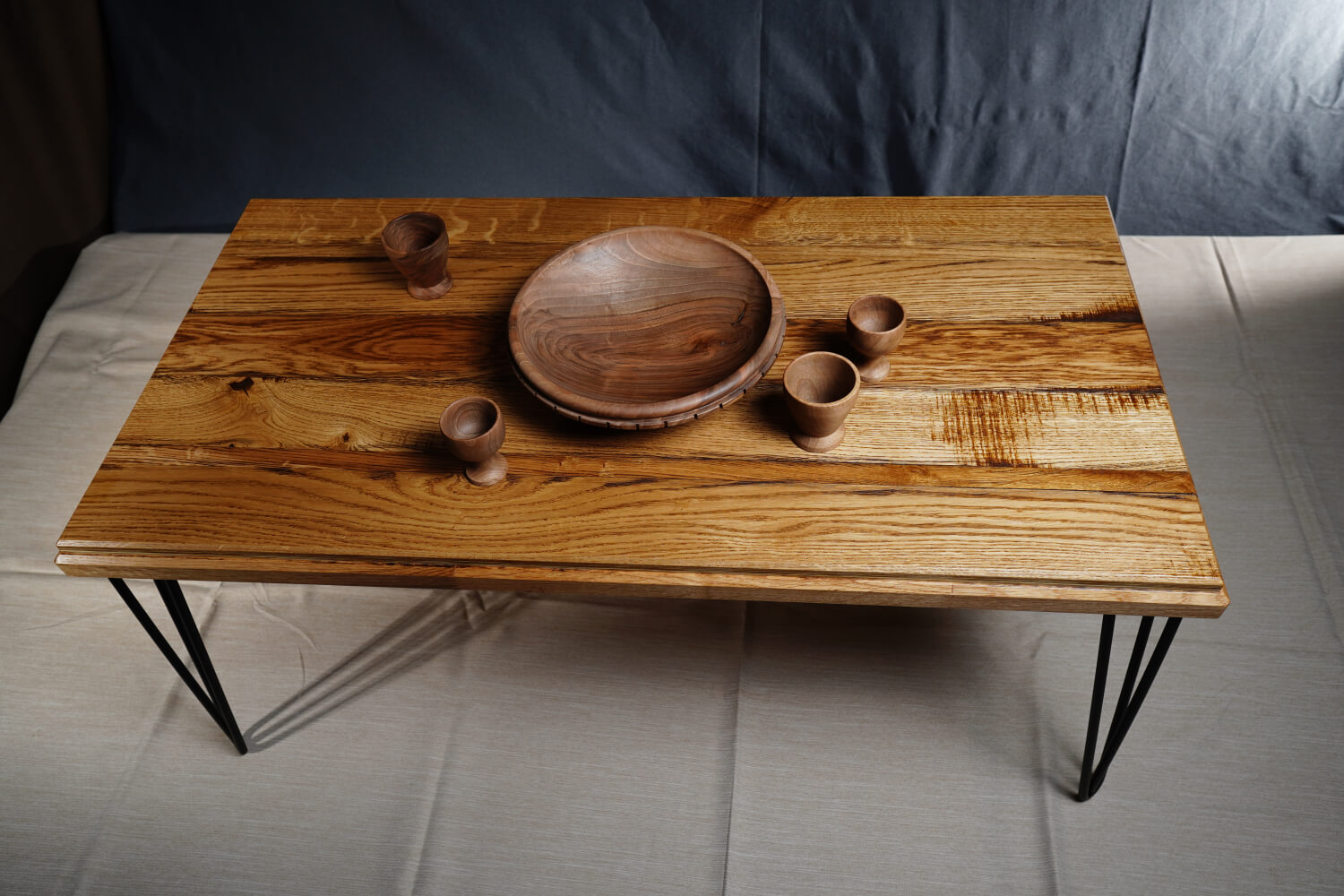 Завършеност и Стил Хаосът на вътрешната мозайка е овладян от солиден, тъмен кант (борд), който рамкира плота като картина. Тънките черни крака тип „hairpin“ допълват тази рамка и придават лекота на конструкцията, позволявайки на красивия дървен плот да бъде безспорният акцент в стаята.