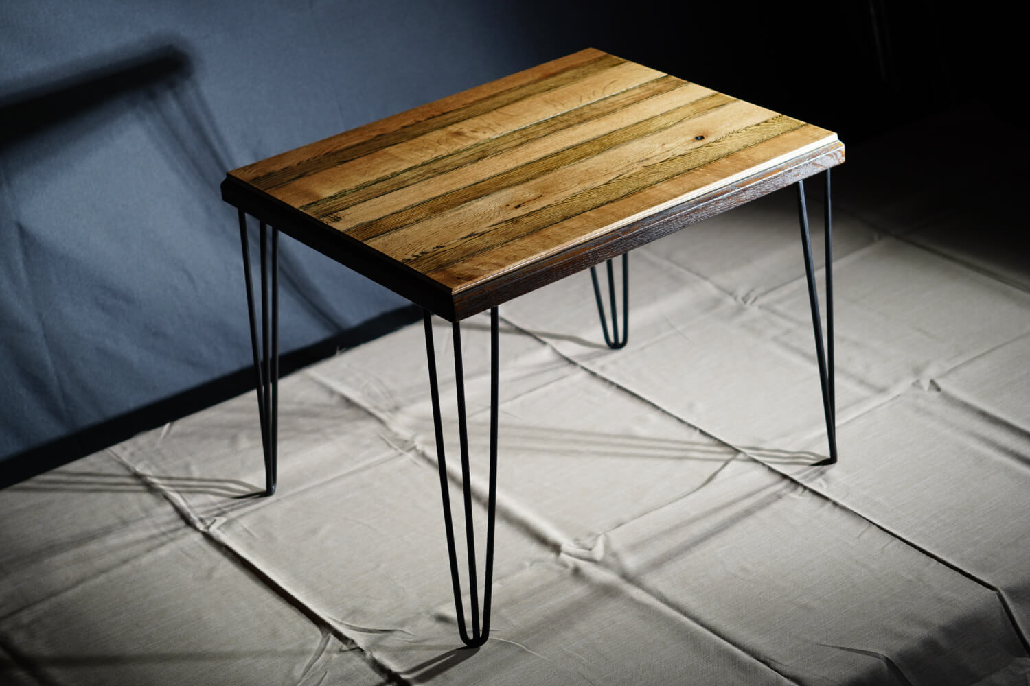 Лек и Въздушен силует Тежкият, солиден плот „левитира“ върху тънки метални крака (hairpin legs). Това класическо за стила Mid-Century Modern решение позволява на масата да бъде стабилна, без да затваря пространството визуално. Тъмният кант на плота кореспондира с черния цвят на краката, рамкирайки красиво дървесната картина.