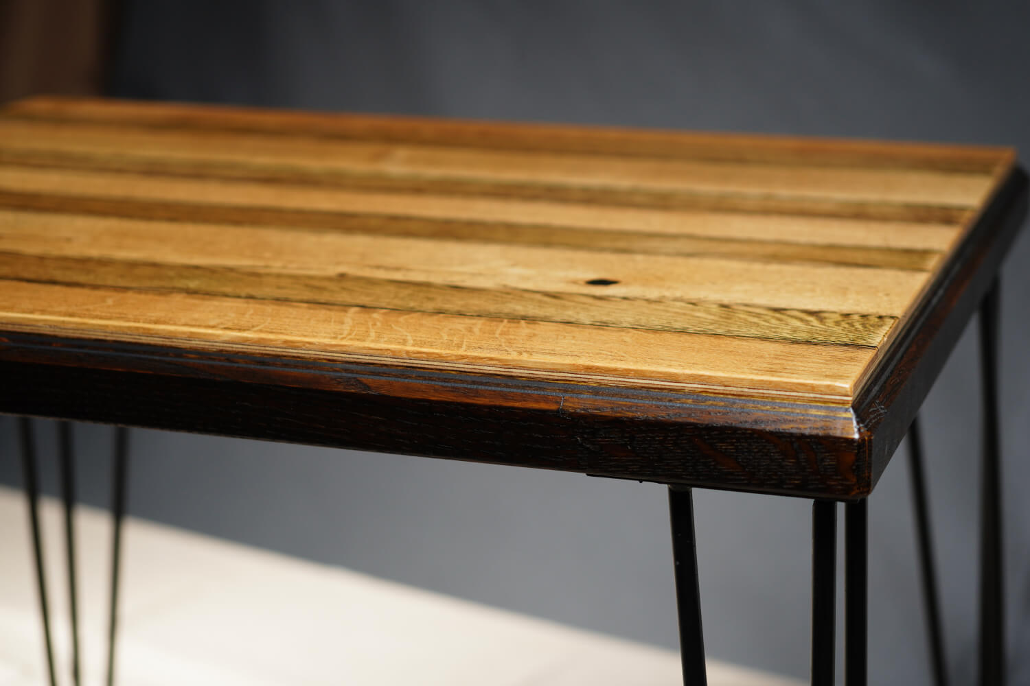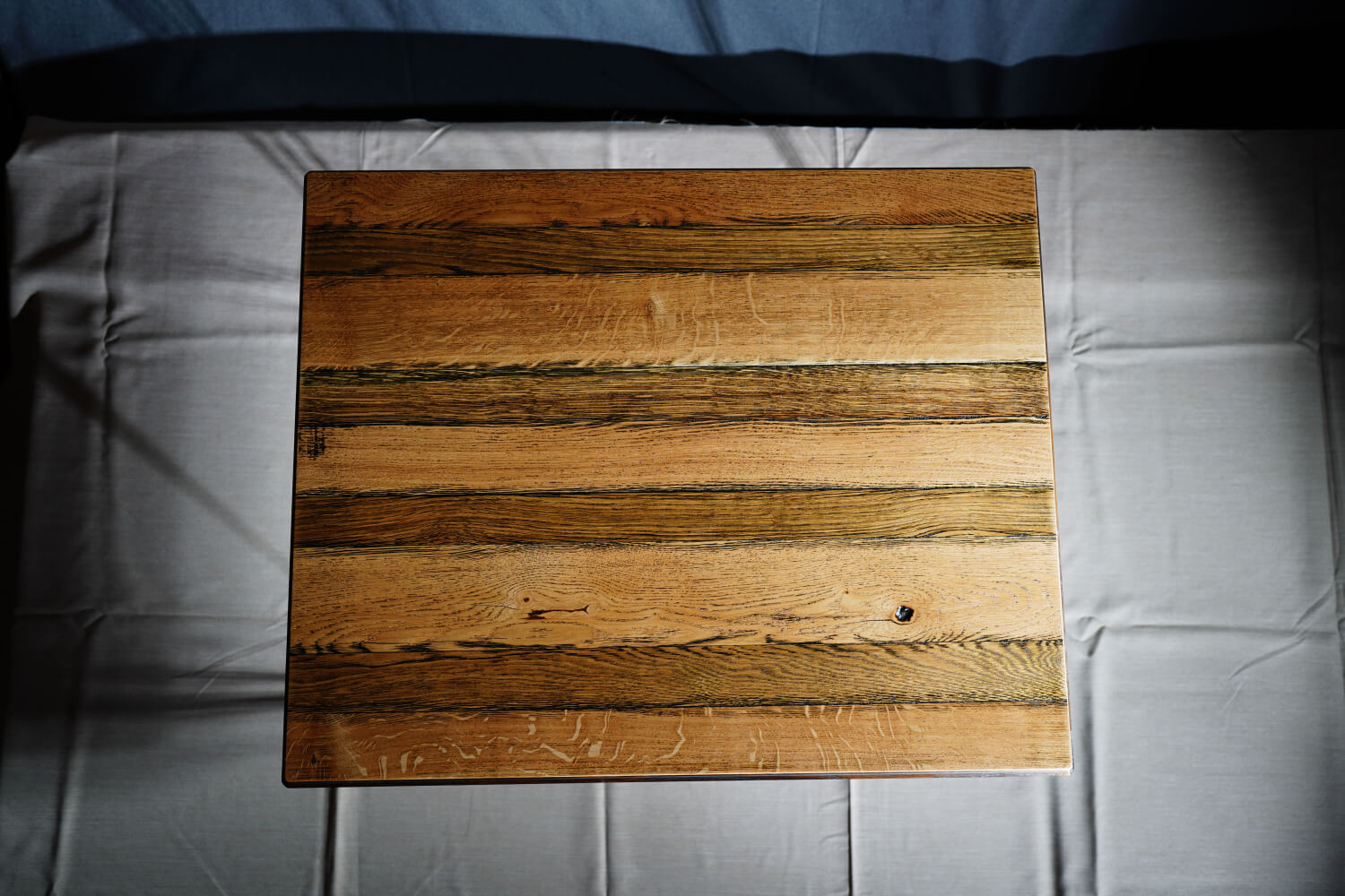Геометрия на природата Тази маса е тържество на „чистата линия“. За разлика от сложни мозайки, тук дизайнът залага на естествения хоризонтален ритъм. Ламелите са подредени така, че да подчертаят контраста между светлата беловина и тъмното сърце на дървото, създавайки уникален „баркод“ от природата.
