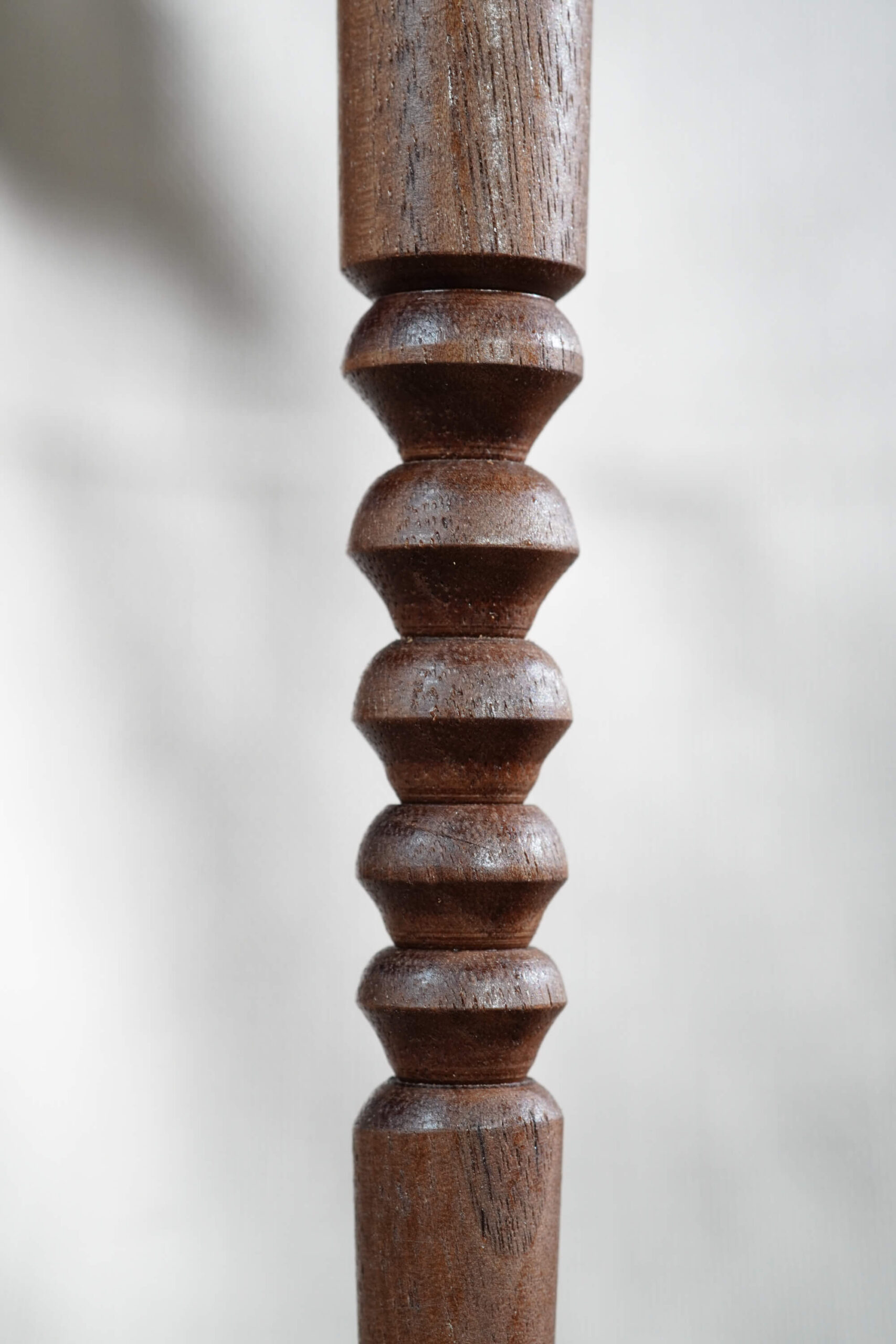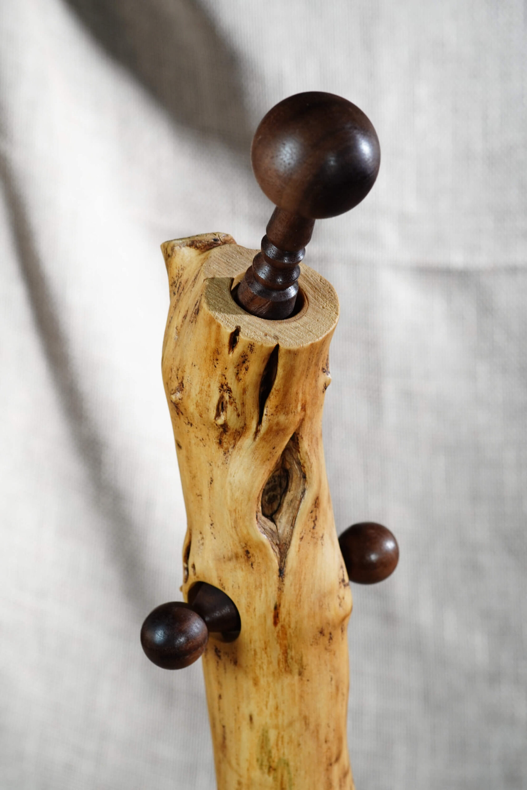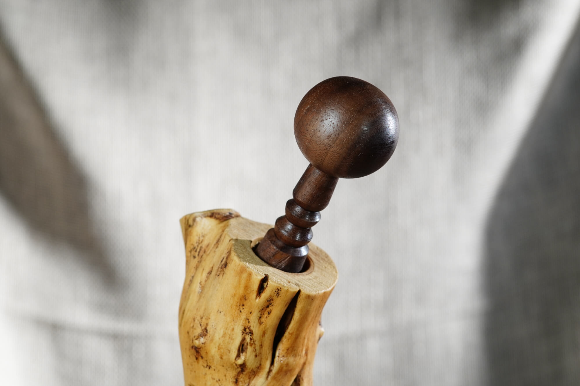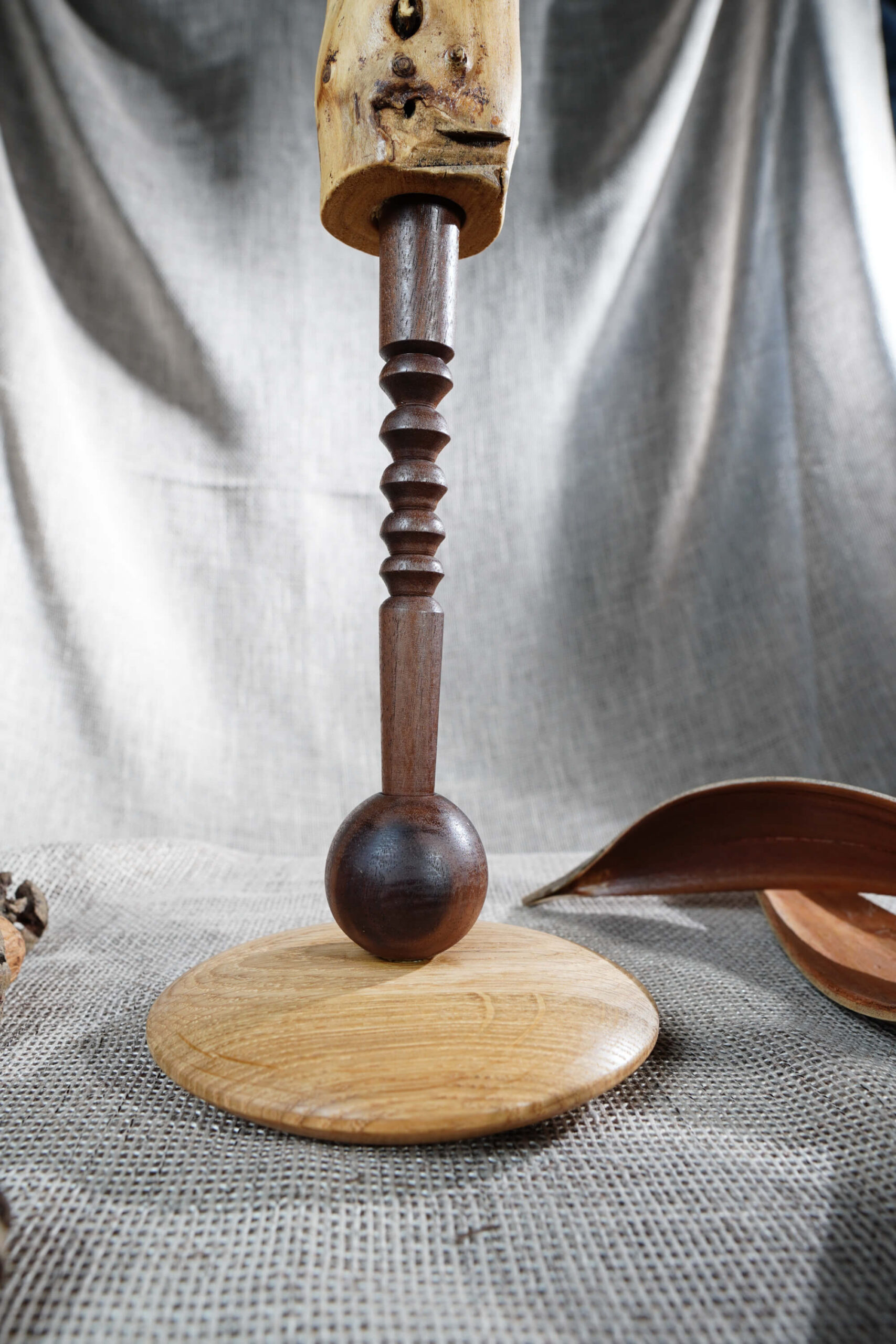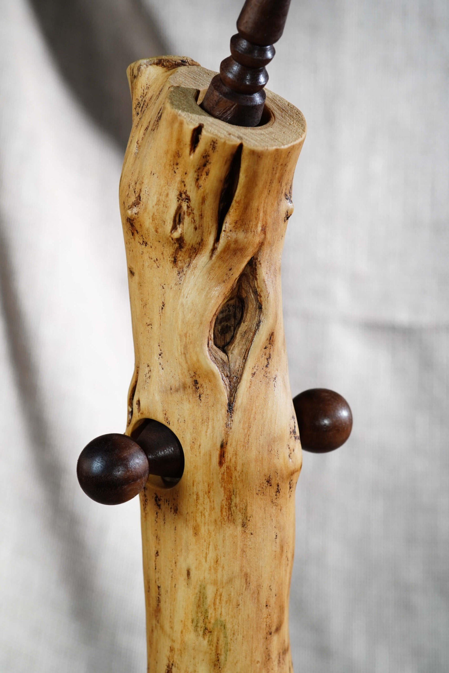 Елегантност и Опора Контрапункт на дивата сърцевина е основата и върхът, изработени от тъмен, наситен орех. Те са прецизно струговани с геометрични елементи – сфери и пръстени, които добавят ритъм и архитектурна стойност. Тъмното дърво преминава през светлото като гръбнак, символизирайки устойчивост и баланс.