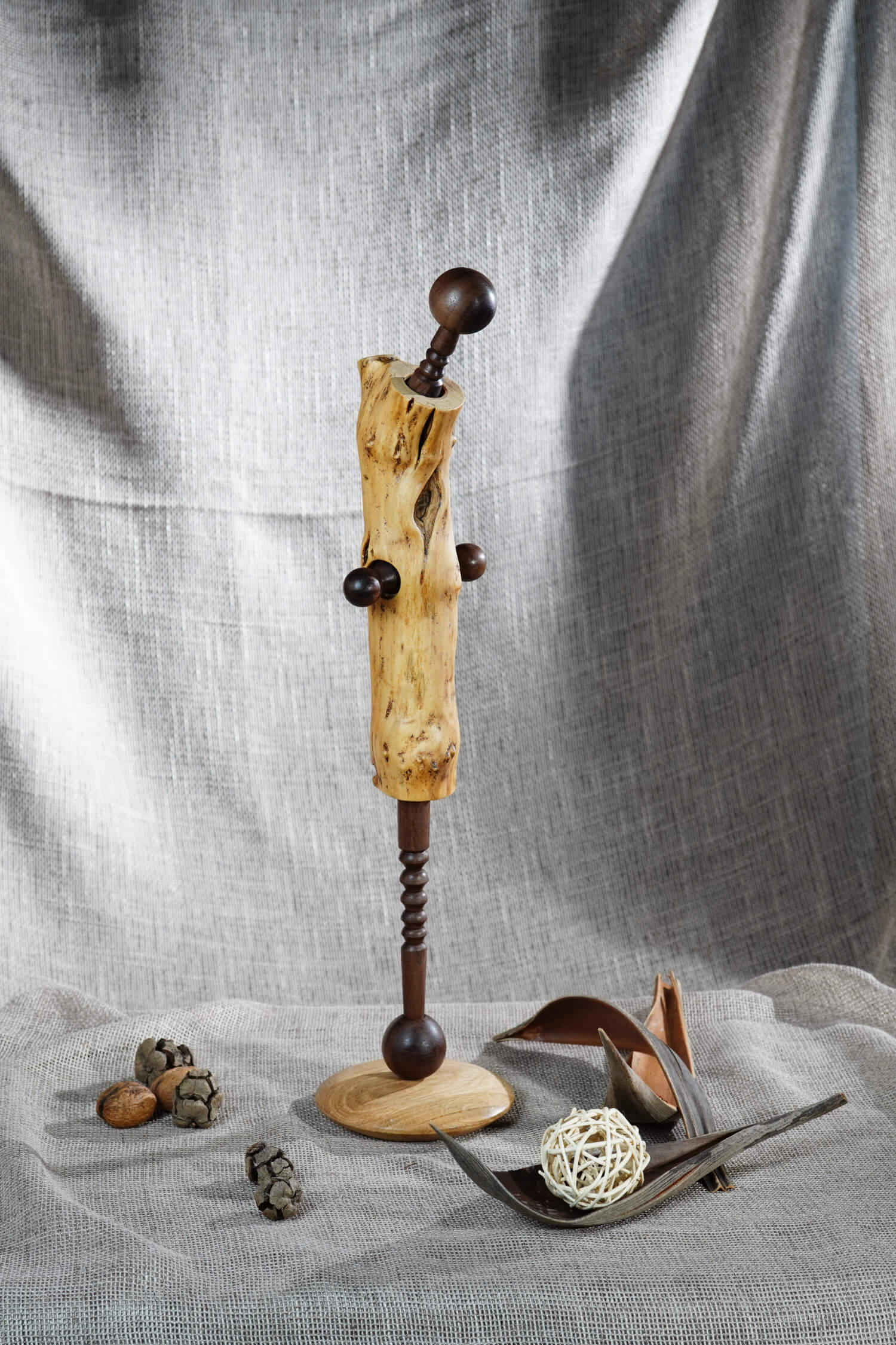 Хармония на противоположностите Тази скулптура е визуална поема за дървото. Тя разказва историята на материала в две действия – неговото естествено, първично състояние и неговата трансформация чрез ръката на майстора. Силуетът е вертикален, наподобяващ древен тотем или стилизирана фигура, която стои гордо в пространството.