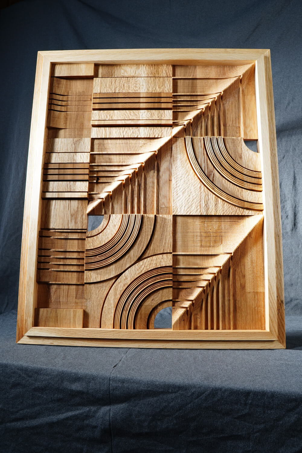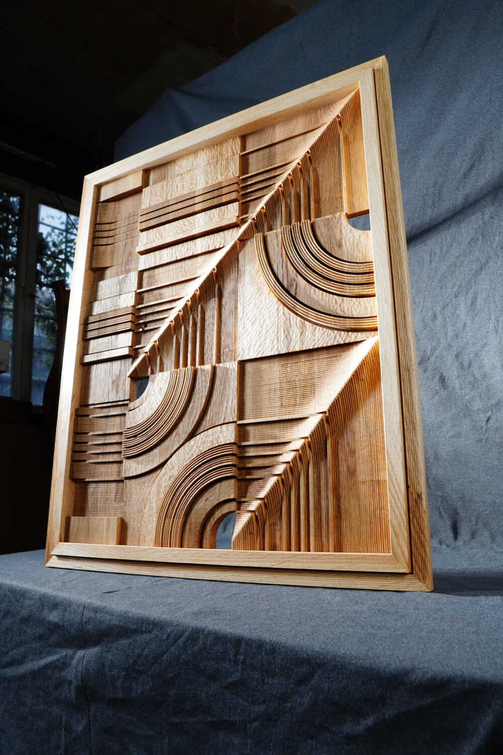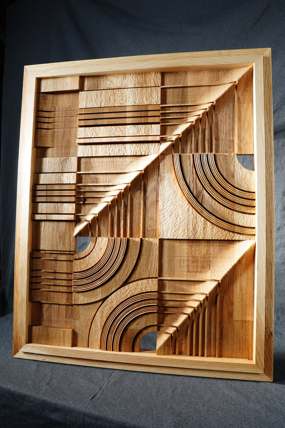 Динамика в покой Благодарение на дълбокия профил на релефа, творбата изглежда различно от всеки ъгъл. Страничната светлина подчертава „ребрата“ на конструкцията, създавайки драматични сенки, докато фронталната светлина я прави да изглежда като графична рисунка. Дизайнът носи усещане за ред, структура и архитектурна хармония.