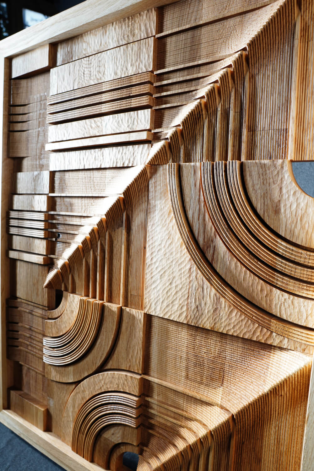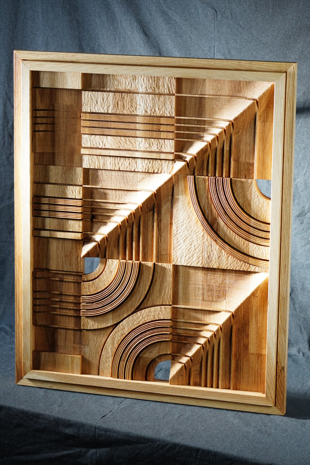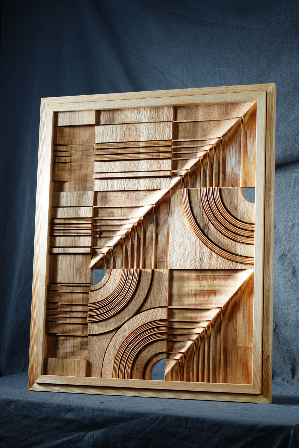 Динамика в покой Благодарение на дълбокия профил на релефа, творбата изглежда различно от всеки ъгъл. Страничната светлина подчертава „ребрата“ на конструкцията, създавайки драматични сенки, докато фронталната светлина я прави да изглежда като графична рисунка. Дизайнът носи усещане за ред, структура и архитектурна хармония.