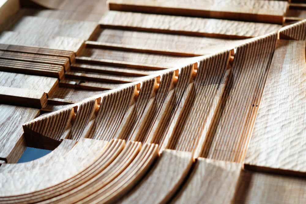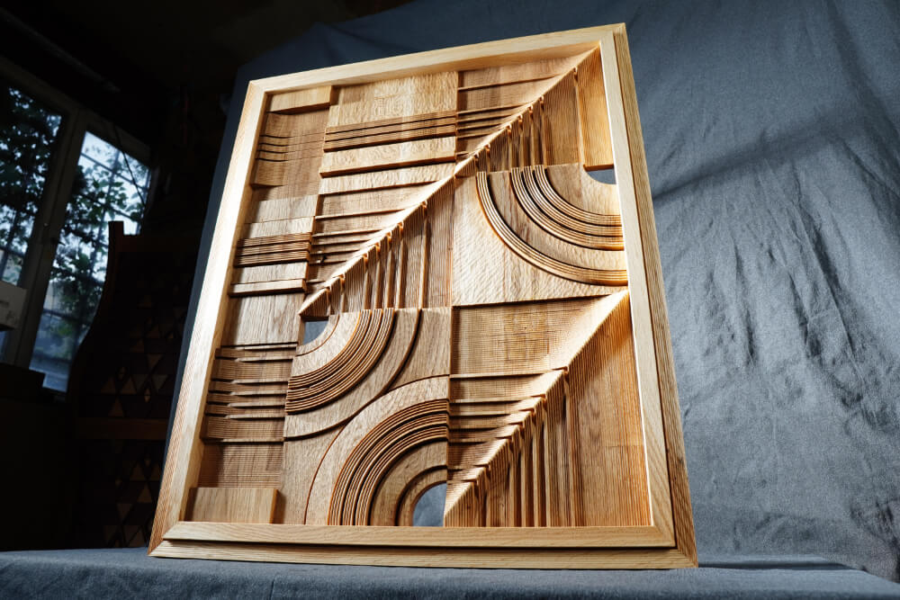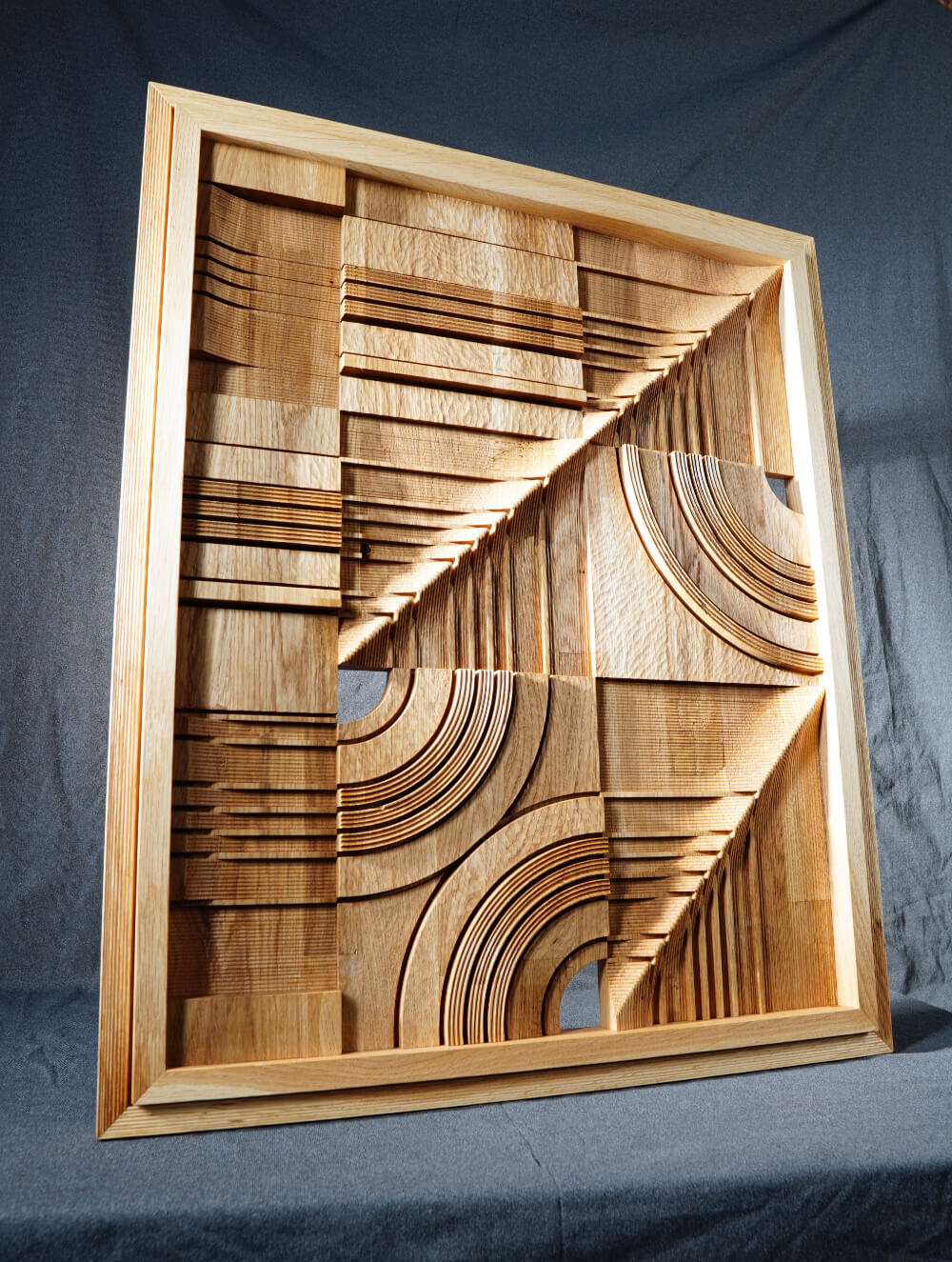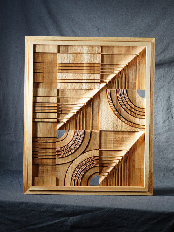 Натурална Текстура и Материал Изработено изцяло от масивна дървесина дъб, паното излъчва топлина и спокойствие. Майсторството личи в детайла – повърхността не е еднородна. Гладките, шлайфани елементи на преден план контрастират с фино текстурирания, „набразден“ фон в дълбочина. Тази разлика в текстурите придава допълнителен обем и тактилно усещане.